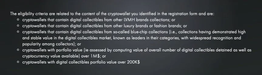 Invitee selection criteria (as listed on the VIA website FAQ) include crypto wallets that contain: digital collectibles from other LVMH brands; or other luxury brands or fashion brands; or blue-chip collections; a portfolio value over $1M (collectibles and cryptocurrency); or digital collectibles portfolio value over $200k. Louis Vuitton will accept cryptocurrency as well as major credit cards, PayPal, and ApplePay for the purchase.